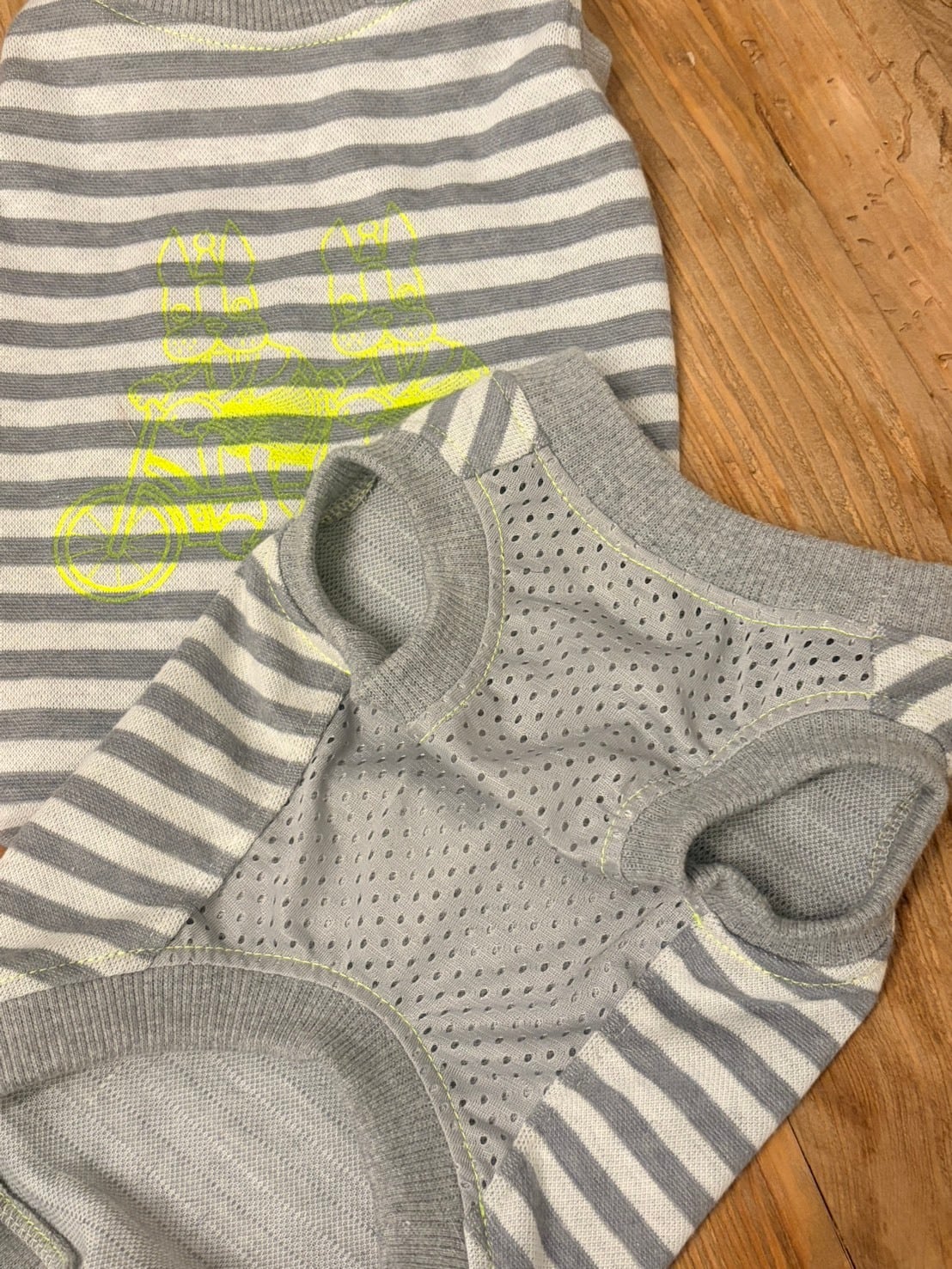 グレーボーダーの生地に蛍光色のイラストがプリントされた ノースリーブ(袖なし)カットソー です